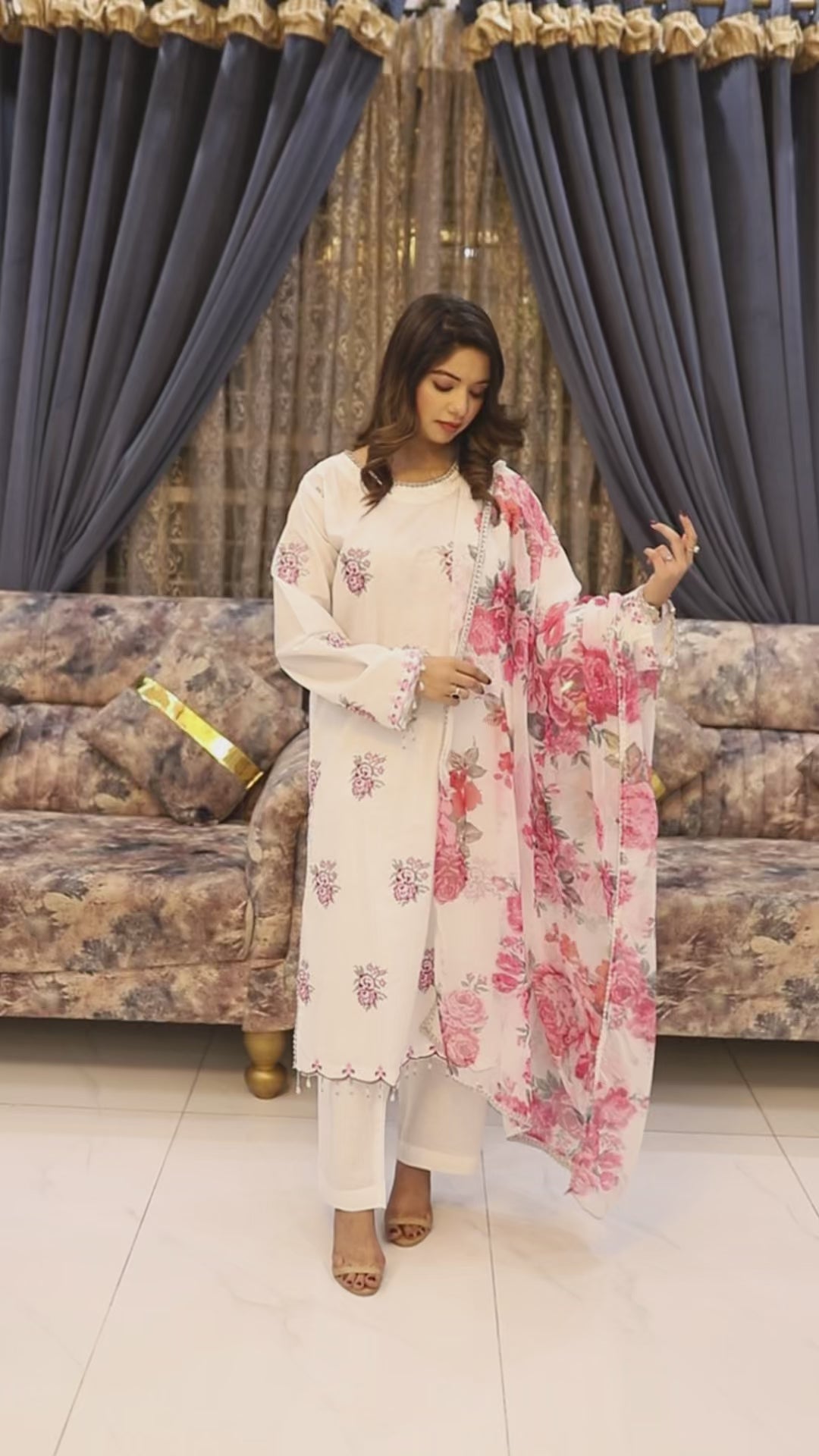 Step into elegance with this exquisitely designed 3-piece embroidered lawn ensemble. The intricate embroidery on the shirt and trouser reflects timeless sophistication, while the lightweight organza dupatta adds a graceful touch of luxury. Whether for festive celebrations or casual gatherings, this outfit blends comfort, charm, and refined style—making it an essential addition to your wardrobe.